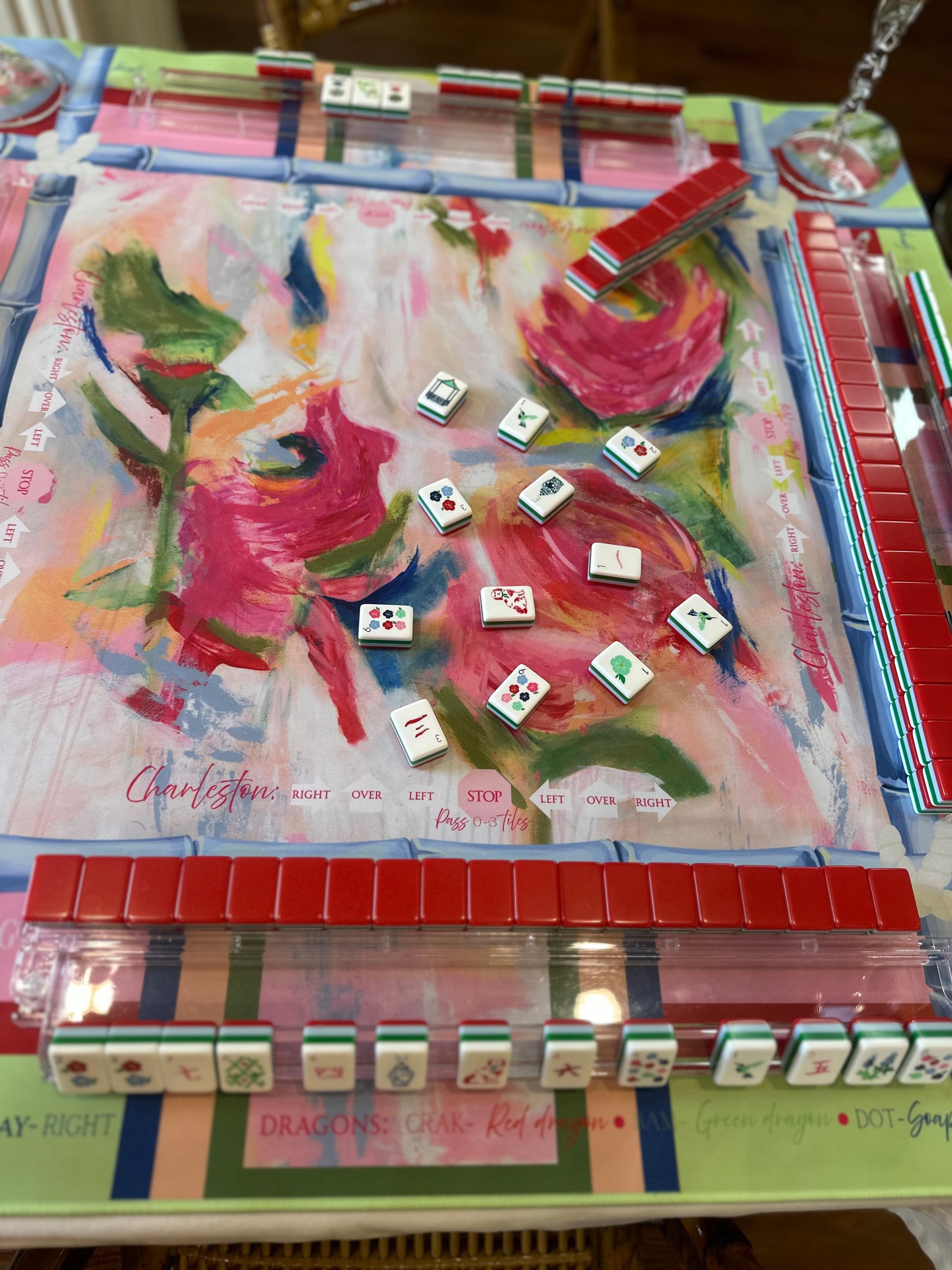 Bring Southern charm and grandmillennial flair to your game night with the In Bloom Mahjong Mat from Mahjong Moxie. Featuring a vibrant hand-painted rose motif framed by chic blue bamboo and playful colorblocking, this mat is equal parts statement piece and functional game accessory.