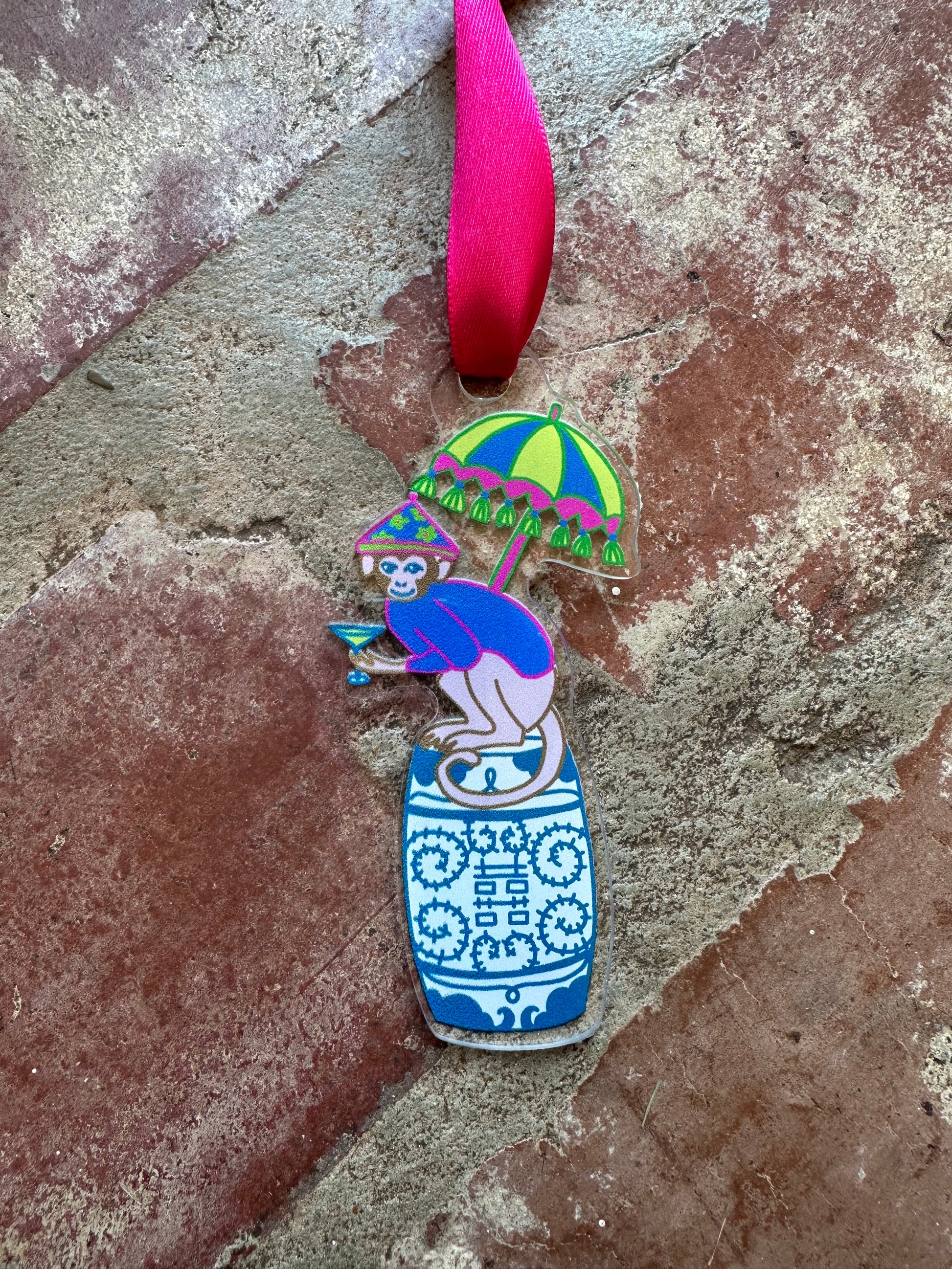 Playful, polished, and full of charm — this Chinoiserie-inspired acrylic ornament is sure to steal the spotlight. Featuring a colorful monkey perched atop a blue-and-white garden stool with a vibrant parasol in hand, it’s a whimsical nod to timeless chinoiserie motifs with a modern Mahjong Moxie twist.
