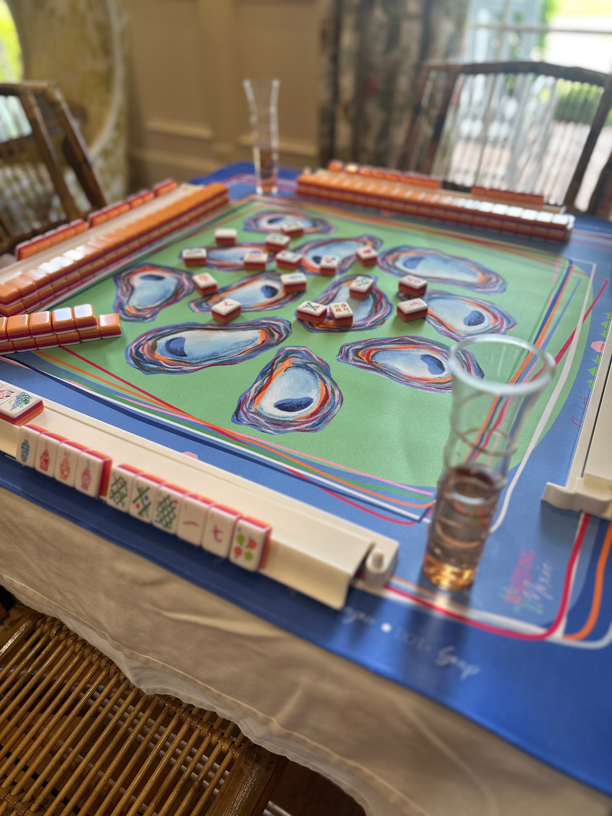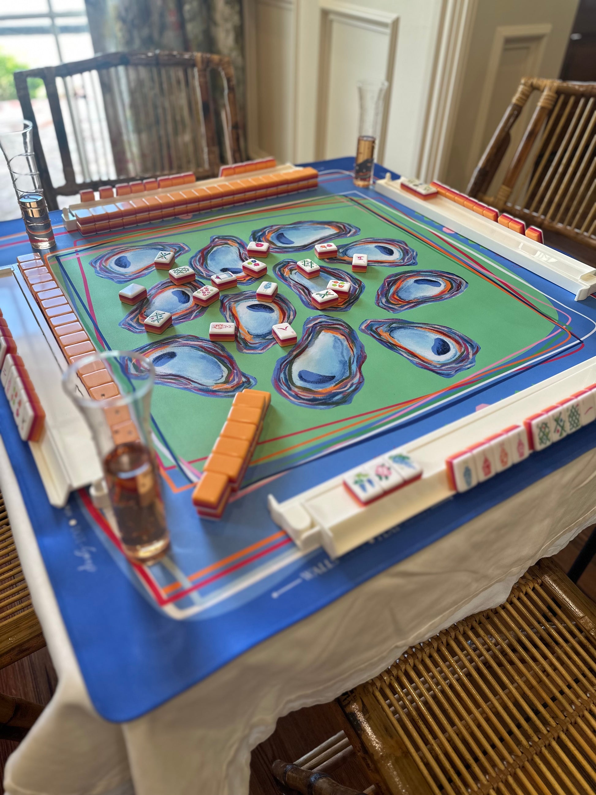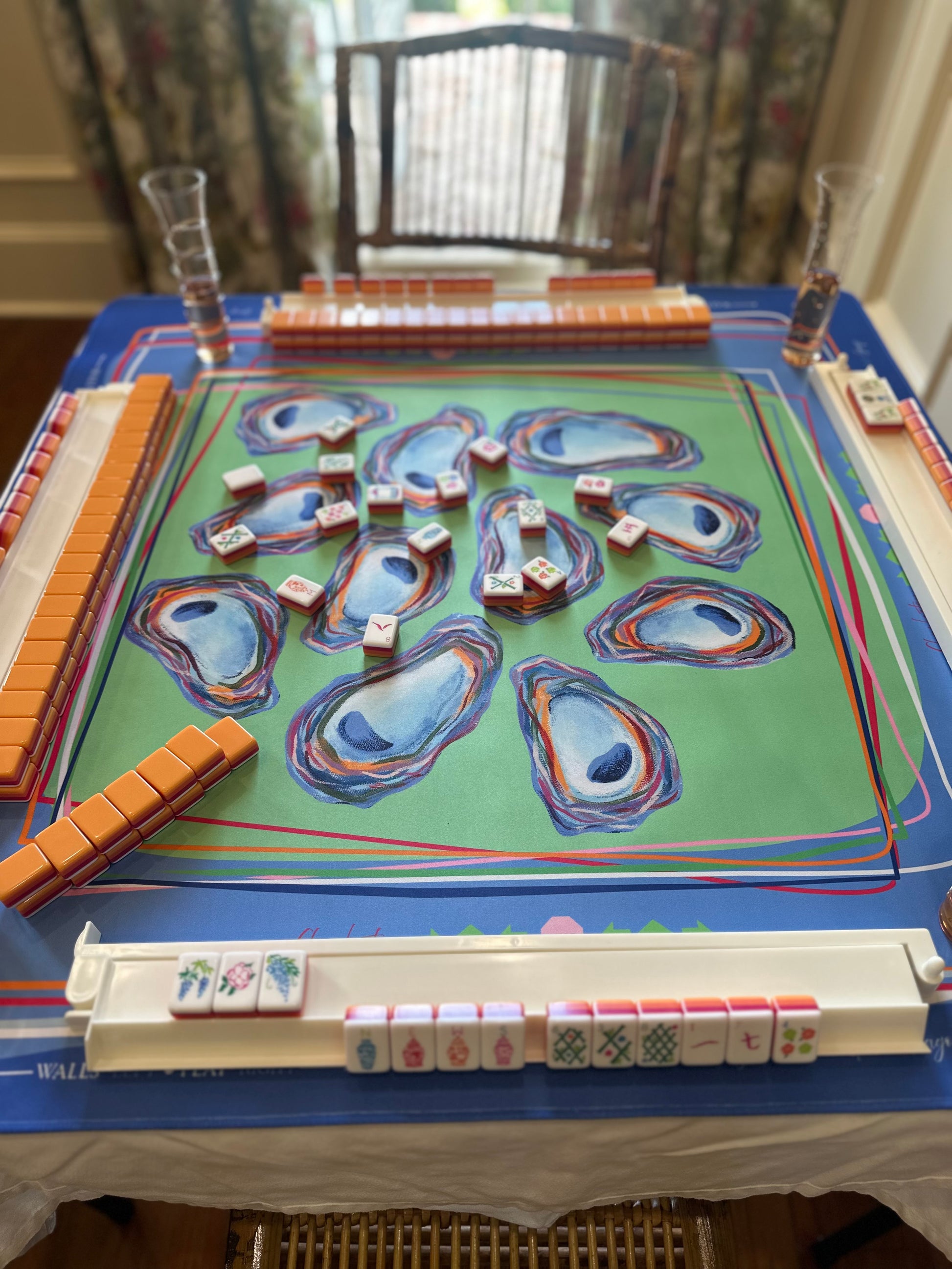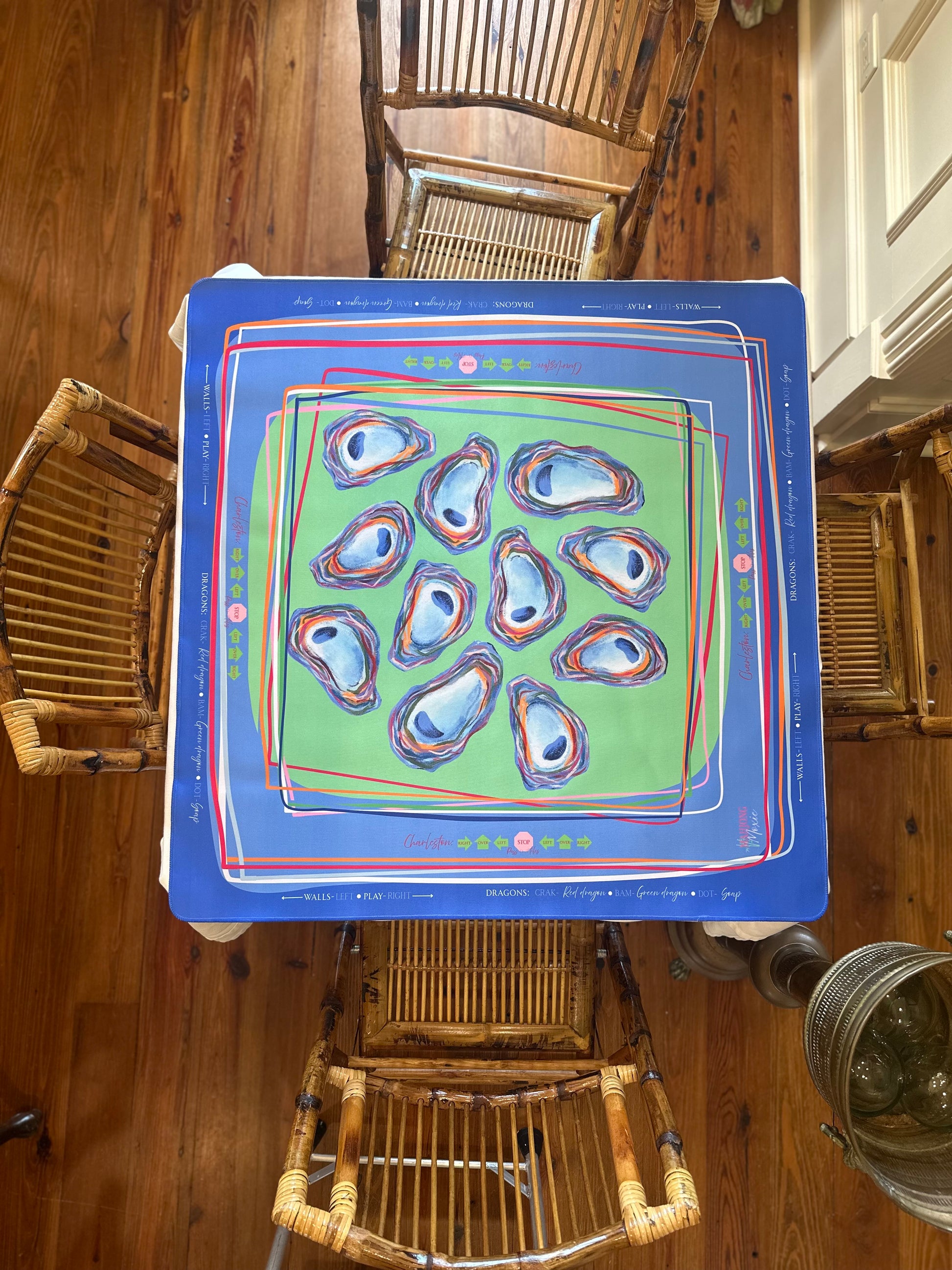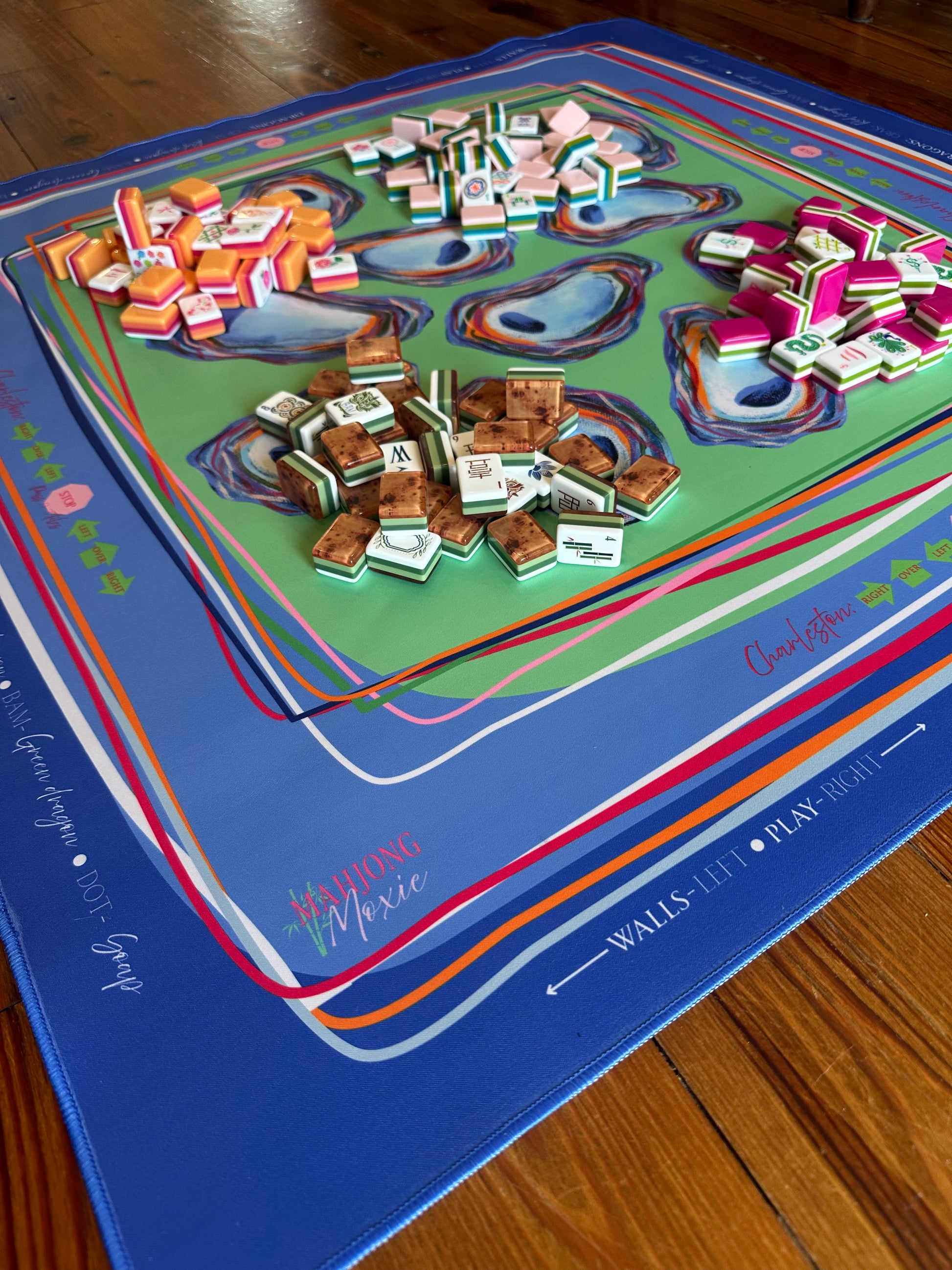 Our Oyster Confetti mat is a celebration of coastal charm and colorful gameplay. Featuring hand-painted oyster shells in painterly hues and layered ribbon-like borders, this design brings a preppy, Southern twist to your Mahjong table. The mat includes all the classic gameplay guides you need — Charleston steps, wall building, dice direction, and tile placement — so whether you're a seasoned shark or a stylish beginner, you’re ready to play in full color.